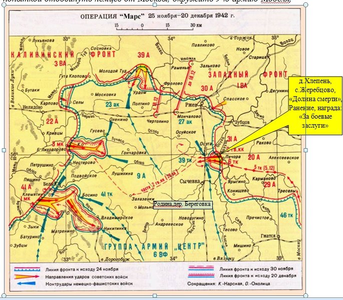 «К сожалению, у нас нет свидетельств, переписки с фронта, поэтому невозможно точно проследить судьбу солдата-сержанта Иванова Фёдора Фёдоровича вплоть до ноября 1942 года. А потому начнем с официальных документов о награждении его боевой наградой, медалью «За боевые заслуги», которой он был отмечен в самый первый день начала печально известной Ржевско-Сычёвской операции «Марс» (25.11. – 20.12.1942 г.) Западного фронта (командующий генерал-полковник И.С. Конев). Эта операция является второй попыткой отодвинуть немцев от Москвы, окружить 9-ю армию Моделя, ликвидировать Ржевский выступ. Отцу уже 34 года. Он командир саперного отделения в 141-м саперном батальоне 33-й отдельной саперной бригады в 20-й армии. Награждён за умелые и своевременные действия подразделения в бою, который начался в 9:20 утра 25 ноября, где и был легко ранен у села Жеребцово, что недалеко от старинного села Хлепень, но поле боя не покинул», – с особой грустью и в то же время с гордостью продолжает рассказ об отце ученый Сургутского госуниверситета.