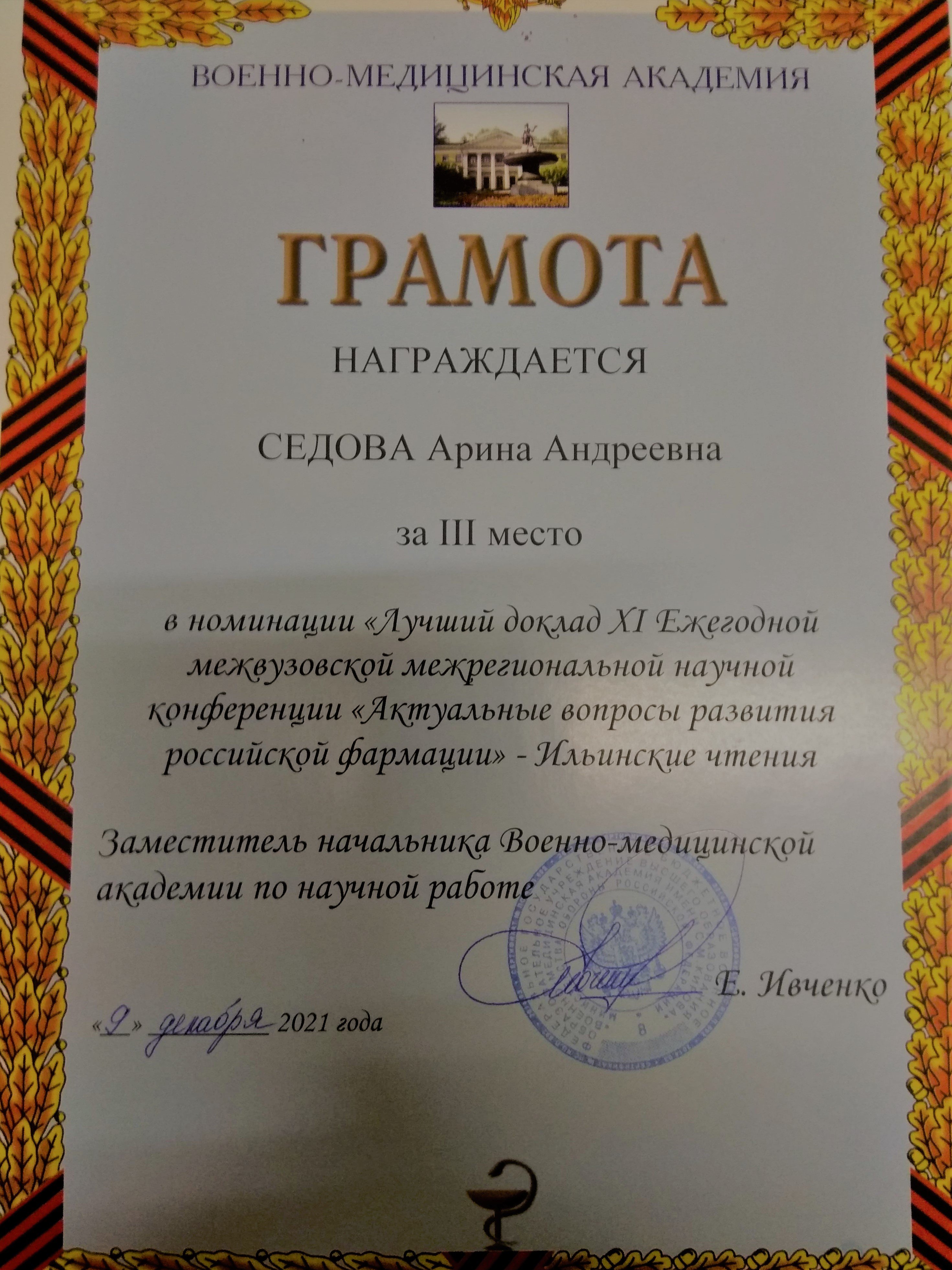 Студентка второго курса специальности «Сестринское дело» Медицинского колледжа Сургутского госуниверситета Арина Седова стала обладательницей диплома третьей степени XI Ежегодной межвузовской межрегиональной научной конференции «Актуальные вопросы развития российской фармации» – Ильинские чтения. Конференция прошла 9–10 декабря в Военно-медицинской академии им. С. М. Кирова (Санкт-Петербург).