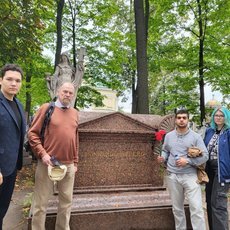 Фото 3- Победители олимпиады по сопромату 2024 года возлагают благодарственные цветы к могиле Леонарда Эйлера.
